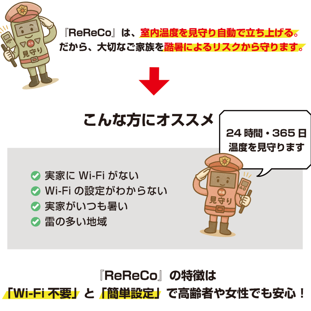 雷や落雷による瞬間停電、エアコン切り忘れ、高齢者の節電による室温の上昇・異常高温リスクを未然に防ぎます。